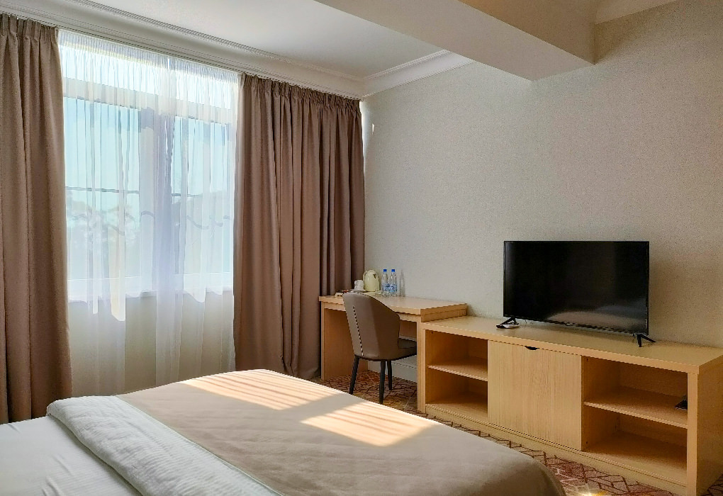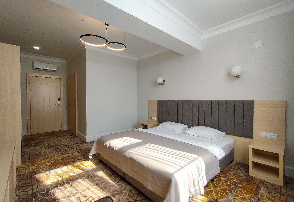 Площадь номера - 27 кв.м. 1 комната. 2 осн. места. В номере: телевизор; холодильник; кондиционер; сейф; 1-спальные/ 2-спальная кровать; чайник; санузел. 1 доп. место: Еврораскладушка - ограничений по возрасту нет.